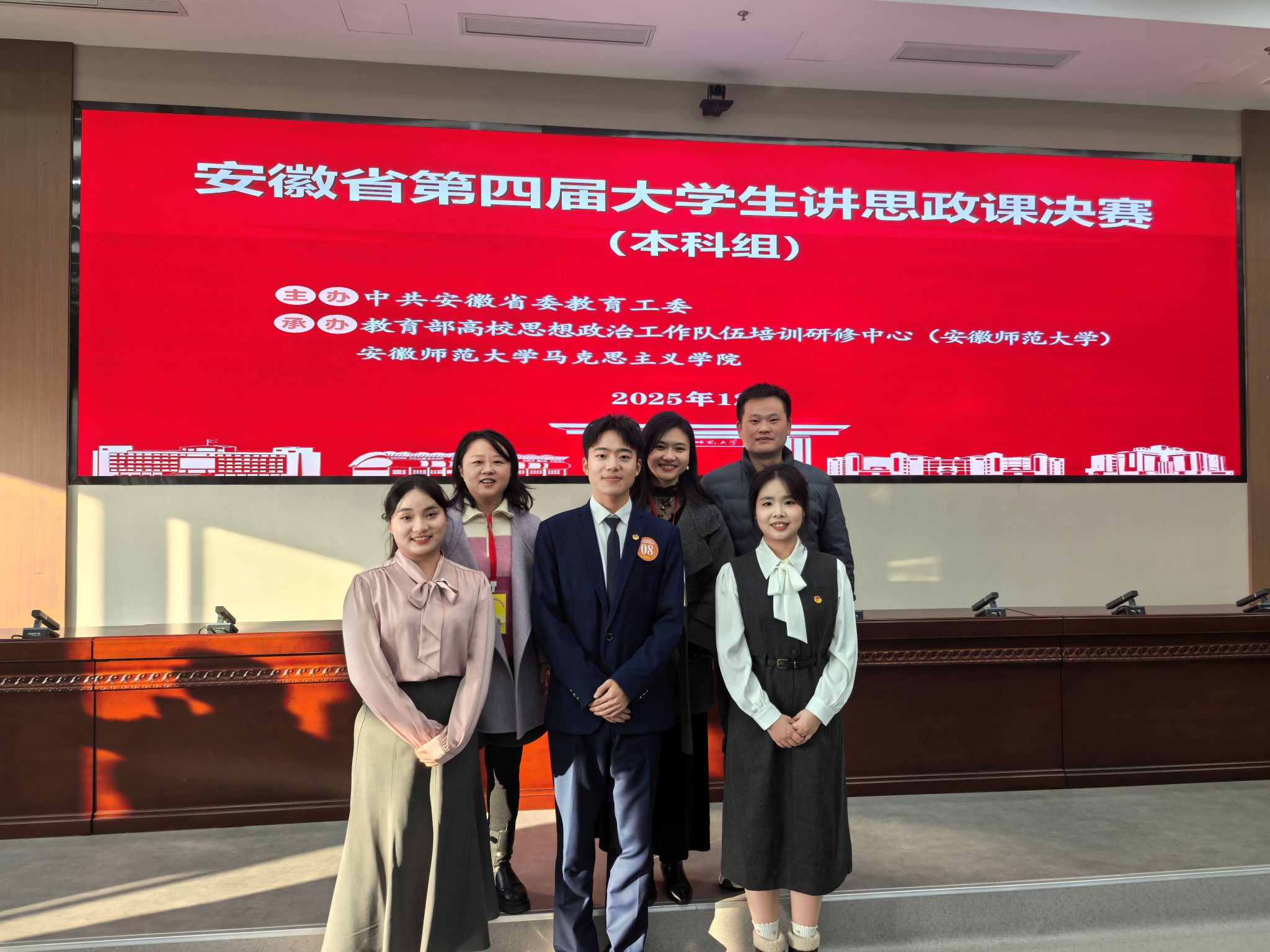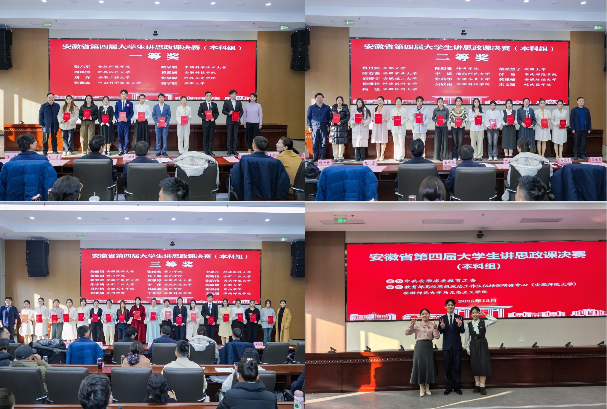 1227日,由中共安徽省委教育工委主办、教育部高校思想政治工作队伍培训研修中心(安徽师范大学)、安徽师范大学英国365集团承办的安徽省第四届大学生讲思政课决赛在安徽师范大学隆重举行。经过激烈角逐,比赛共产生特等奖6名、一等奖8名、二等奖13名、三等奖18名。我校在皖北片区赛脱颖而出入围省赛的3支队伍分别获一、二、三等奖,我校成为获奖数量最多的4所学校之一。