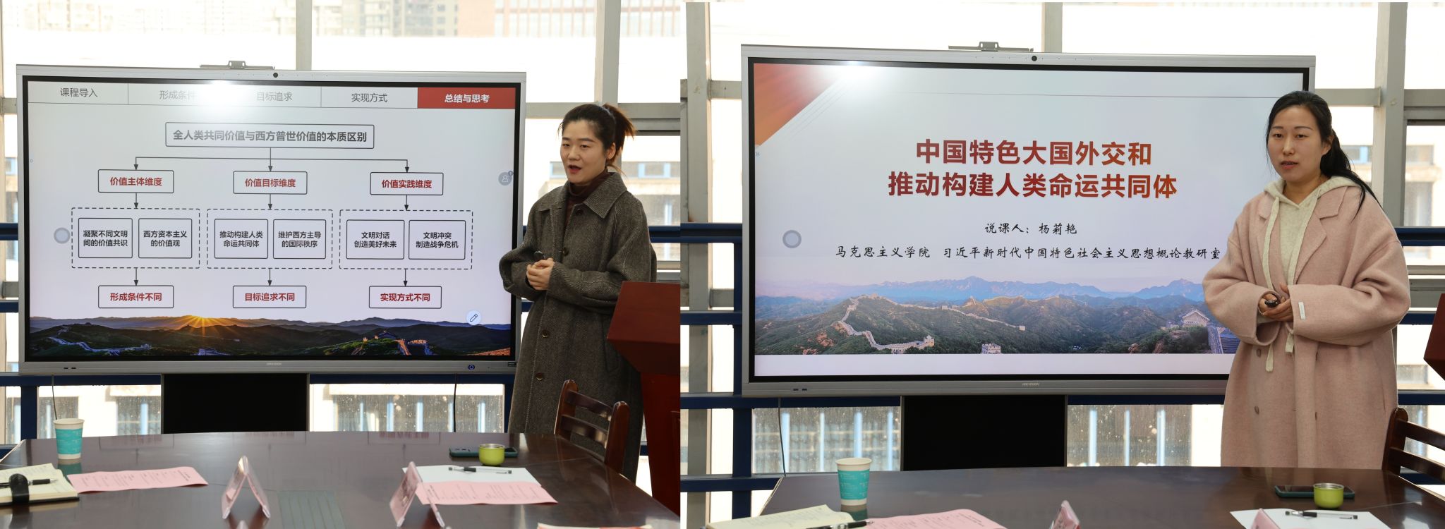 备课会上,青年教师曹莎莎围绕“全人类共同价值同西方普世价值的本质区别”主题,从价值主体、价值目标和价值实现三个维度进行了教学展示。青年杨莉艳就第十六章“中国特色大国外交和推动构建人类命运共同体”教学内容,以“析源—立意—破局—解题”的逻辑脉络进行了说课展示。吴雪龙、李国宏、卓玥等紧扣“党的二十届四中全会精神为何融、融什么、怎样融”核心问题,从导入设计、理论阐释、教学方法等多角度展开深入研讨。校领导认真观摩展示、听取研讨,对备课会成效给予充分肯定,并就持续提升思政课育人实效提出明确要求。